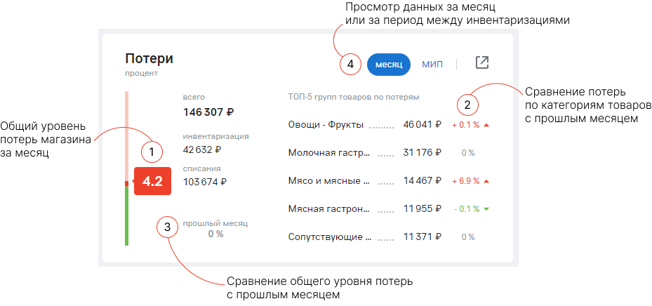 Потери в процентах отображают общий уровень потерь магази на за месяц. Норматив устанавливается для каждого магазина на основе статистических данных по магазинам торговой сети «Пятёрочка» — на шкале выделен зеленым.