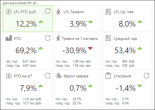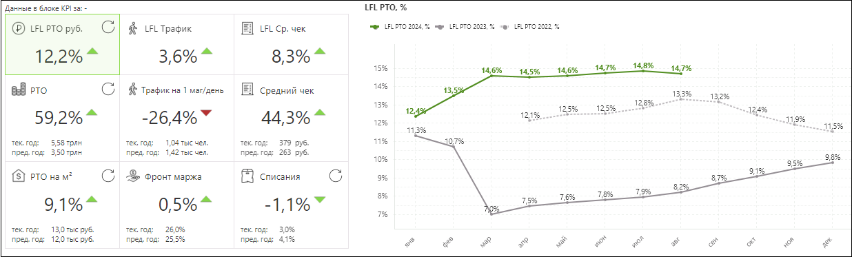С помощью отчета вы можете отслеживать динамику ключевых операционных показателей магазина по месяцам, в том числе LFL.